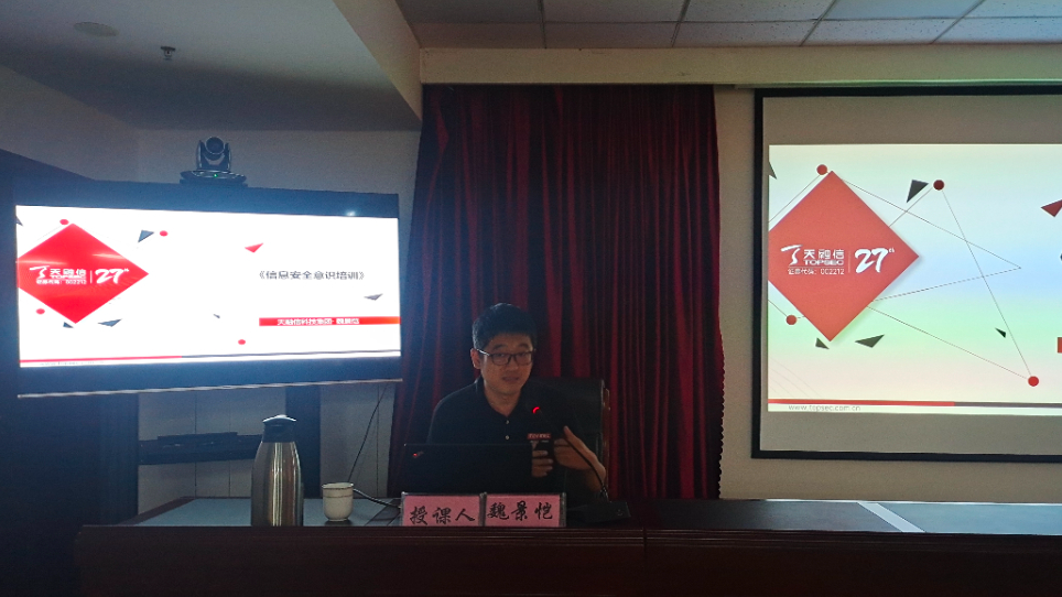 本次培訓邀請中百信信息技術公司技術總監(jiān)劉萌萌及天融信科技有限公司山東平臺安全顧問魏景愷分別圍繞等級保護、信息安全意識、信息泄露方式與防范措施等內(nèi)容進行講解。
